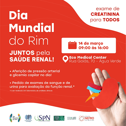 Em alusão ao Dia Mundial do Rim, o Eco Medical Center realiza, na quinta-feira (14 de março), avaliações gratuitas aos pacientes, para que possam verificar a saúde dos seus rins. A campanha tem o objetivo de disseminar informações sobre as doenças renais com foco na prevenção, diagnóstico precoce, tratamento adequado e redução do impacto da doença renal em todo o mundo.